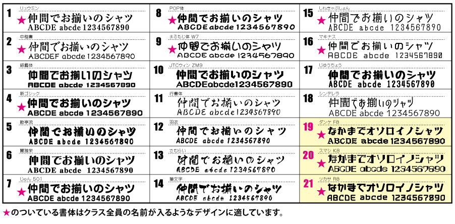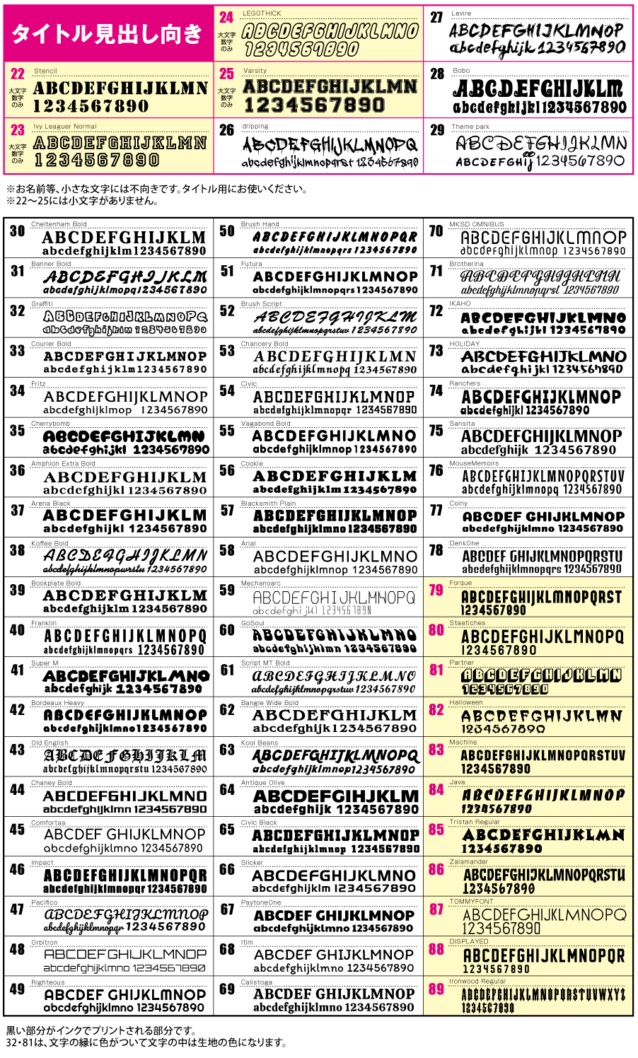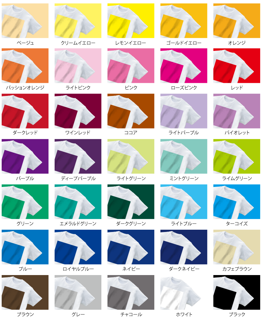 HOME | デザインについて | プリントカラー・書体 デザインの色はこちらからお選びください。 デザインの色はこちらから ※上記カラーは、ご利用のモニター環境により見え方が異なりますので実際の仕上がりとは差異があります。また、淡色・濃色のウェアで発色が違って見えます。※特色インクは粒子が大きいため、細かいイラストや文字をプリントするのに向いていません。 日本語の書体はこちらからお選びください。 日本語の書体はこちらから 英語の書体はこちらからお選びください。 英語の書体はこちらから ページトップへ