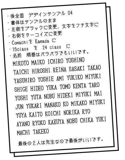 全員の名前が入るようなデザインの場合は、名前の間違いが無いようにできるだけ大きくわかりやすい文字で書いてください。別紙で送って頂いたり、お名前の部分だけLINEで送って頂いてもOKです。