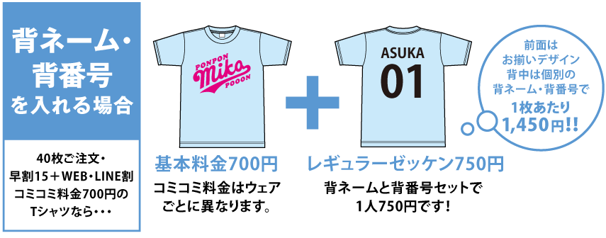 1人ずつ違う背ネームや背番号を入れる場合も、コミコミ料金に背ネーム・背番号の料金を足すだけです。