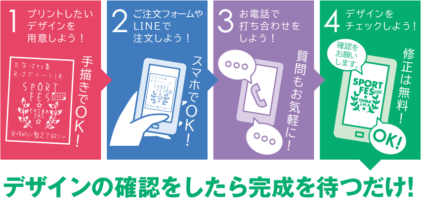 デザインの確認をして頂きOKのお返事を頂きましたらプリント工程を進めます。OKを頂いたあとはデザインの修正や変更はできなくなりますので、文字の間違いなどが無いか、よく確認してからお返事をお願い致します。