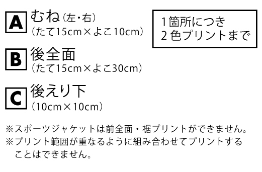※プリント場所を増やしたり色数を増やす場合は1箇所1色増えるごとに上記追加料金を足してください。